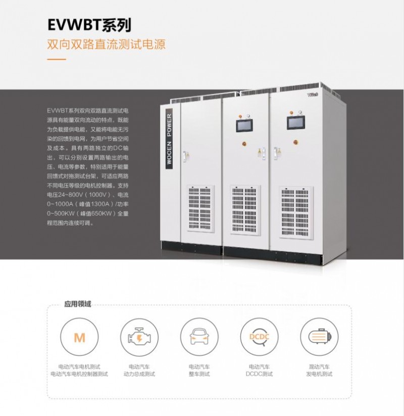 EVWBT-050-800型双向双路直流测试电源具有能量双向流动的特点,既能为负载提供电能,又能将电能无污染的回馈到电网,为用户节省空间及成本。双向双路直流测试电源具有两路独立的DC输出,可以分别设置两路输出的电压、电流等参数,特别适用于能量回馈式对拖测试台架,可适应两路不同电压等级的电机控制器。