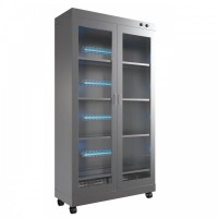 消毒烘干鞋柜器件配置:柜内一套恒温专用烘干设备(吹热风,不发光,不发红),每层一支紫外线消毒灯,柜顶一组控制器(旋钮定时开关2个、门控开关),柜体底部为带调整脚的万向轮,方便搬运及柜体调平。