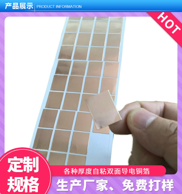 此款自粘铜箔有单面导电和双面导电可供选择,厚度有0.06mm,0.1mm可选。