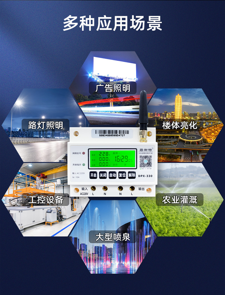 碧斯特远程控制开关适用于远程控制路灯、亮化工程、户外广告棚、水泵、渔排增氧机、卷联机、自动洒水等场景。没有距离限制,只要有4G信号正常就可以开、关设备。