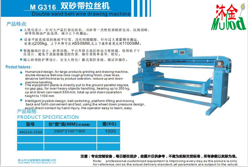 5、整体评价:外观简洁、方便保养,传动部件精密度高,双砂带之间切换精准。重大产品一次性上机,可完成焊缝打磨,和过细面拉丝纹路。