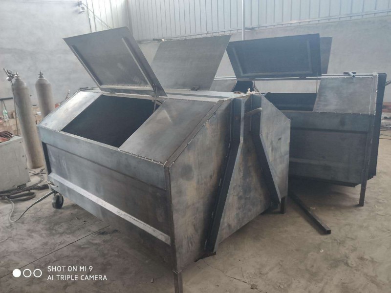 碳钢,边板2mm,底板3mm,带启动撑杆,尾部密封条锁紧,2个万向脚轮、滑道采用槽钢,箱内加强筋处理。