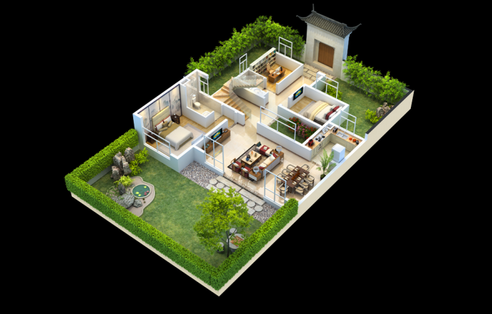 目前,房地产销售行业常用的户型图大致分为以下几类:彩色平面户型图,简称彩平;3D立体户型图,或者叫做户型鸟瞰效果图;整体家居全景户型图动画,人机交互的一种操作方式。