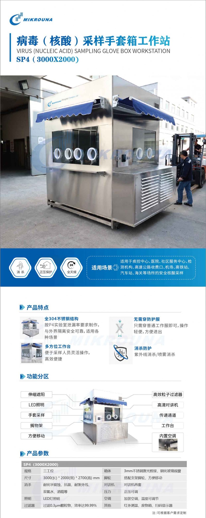 米开罗那是一家按德国商业文化理念和法律程序创建的德国品牌,拥有22年隔离防护类手套箱生产制造经验,核级密封箱室生产工艺。在核酸采样上,我们已经研发生产了一款病毒(核酸)采样手套箱工作站SP4(3000X2000),为核酸采样人员提供了安全以及舒适的采样环境。