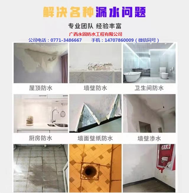 免砸砖技术维修:防水 补漏 防水补漏房屋维修 防水堵漏 防水补漏维修 防水工程施工 防水工程 补水 屋面防水 墙面防水 卫生间防水 公司简介:服务区域:南宁市、兴宁区、青秀区、江南区、西乡塘区、良庆区、邕宁区、武鸣区、横县、宾阳县、上林县、隆安县、马山县 (广西省各区域)周边 维修点 防水公司:配有先进的堵漏防水施工机械设备。公司率先引进国外先进的带压抗渗抗震动的防水堵漏新技术。施工过程中积累了丰富的施工经验,结合各种建筑结构渗漏水的特点,创立了一整套防水、堵漏新工艺。我们可根据您处工程的具体情况,量身定做两种以上的具体防水施工方案,对该工程选用恰当施工材料,以优质的工程质量,实惠的工程价格,配合高品质的材料,
