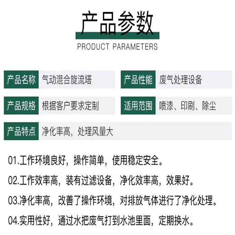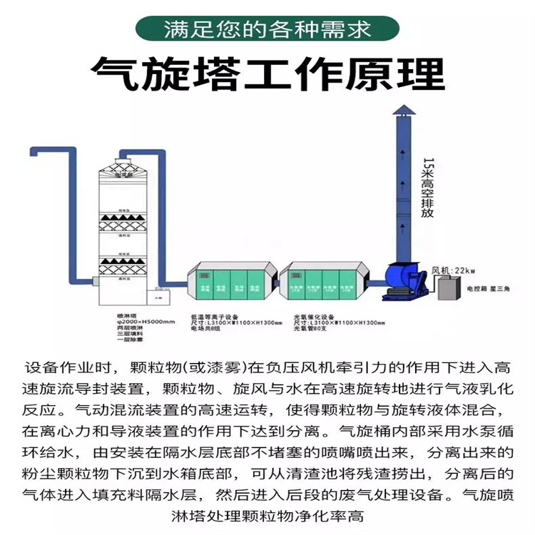 1.产品简单实用、维护方便、用途。气旋喷淋塔适用于各工业领域的废气粉尘净化处理(特别适合如:喷漆废气漆雾处理,打磨抛光粉尘处理等)。