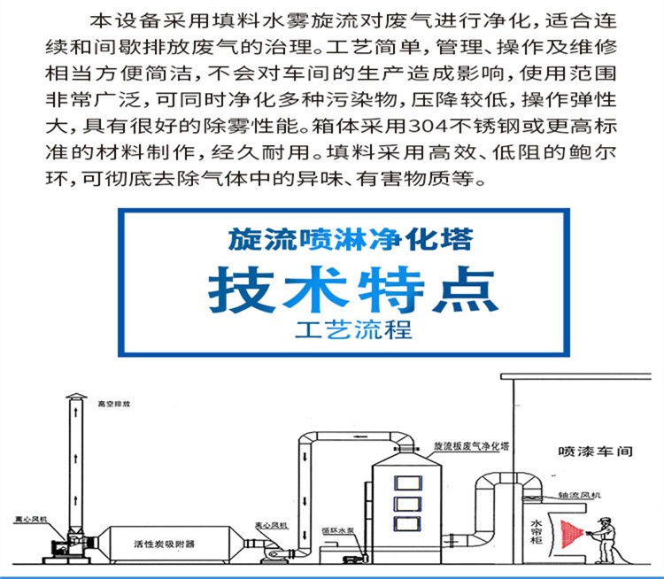 1、喷淋塔具有多种用途:除酸雾、除恶臭、除硫、除尘、除油雾等。广泛应用于工业废气净化、除尘等方面的前处理。