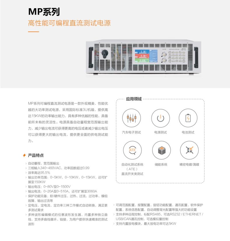 MP系列可编程直流测试电源是由山东沃森电源设计制造的一款外观精美,性能优越的大功率测试电源,采用国际标准3U机箱,提供高达15KW的功率输出能力,具有多种优越性能,具备灵活性,而且该款可编程直流测试电源具备自动量程宽范围输出能力,减少输出电流可获得高电压或者减少输出电压可以获得大的输出电流,提供全面的供电测试能力。