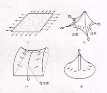 膜结构设计时,可采用下列方法合理施加预应力:在边缘直接张紧膜面(如图a);拉紧周围边索(如图b);拉紧稳定索(如图c);顶升中间支柱(如图d)。