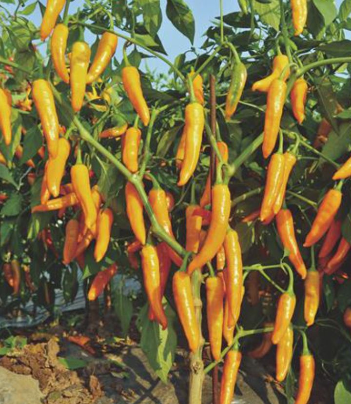 川椒465,育成的黄色辣椒。早中熟,嫩果绿色,成熟果黄色。果长8cm,果肩宽2cm,味辣。小叶片,花多节间密,座果能力强。易脱帽,主要用于剁椒加工和腌制用。