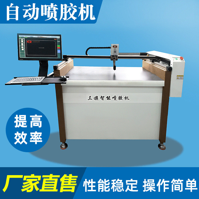 本链接三旗设备属精密式上胶的自动上胶设备,主要应用:鞋面勾线立胶、羽绒服、服饰面料自动画胶/点胶、瑜伽衣、无痕内衣内裤等自动点胶机、自动画胶机。可适合:热熔胶、PUR胶、发泡胶、果冻胶、硅胶等。