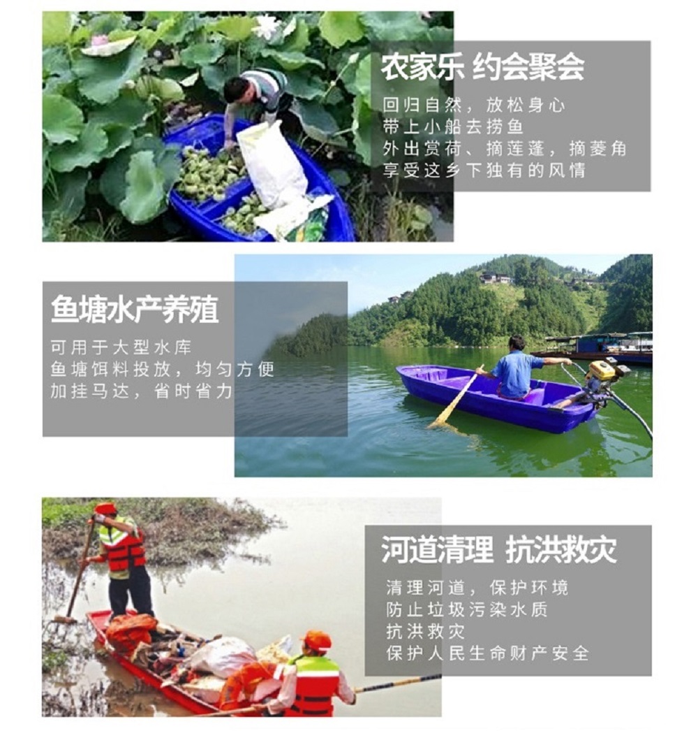 广泛用于水产养殖、渔业养殖、旅游观光、市政河道护理、农家乐、水上娱乐设施等。船体可装马达,也可以配船桨,配顶棚可改装为景观船。