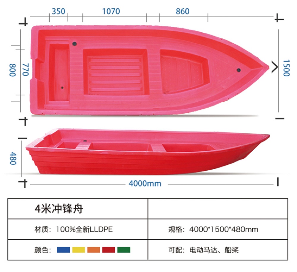 赛普4米塑料冲锋舟,以全新LLDPE为原料,滚塑一次成型。产品采用双层结构设计,使用更加牢固。耐各种水质侵蚀,表面光滑,清洗方便。船体相较于传统木质渔船,轻巧方便,两个人即能轻松抬起。船体表面采用防滑设计,使用更可靠。冲锋舟可配船桨,也可装电动马达,行驶起来更加轻松省力。船头设计成尖头,有利于船体前进,在救灾和救护中起到关键作用。