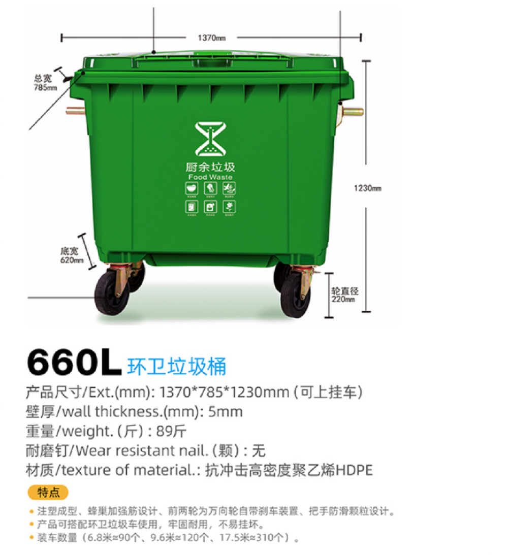 660L塑料垃圾桶特点: