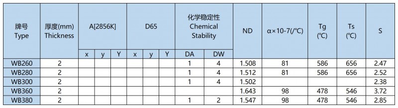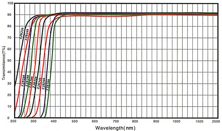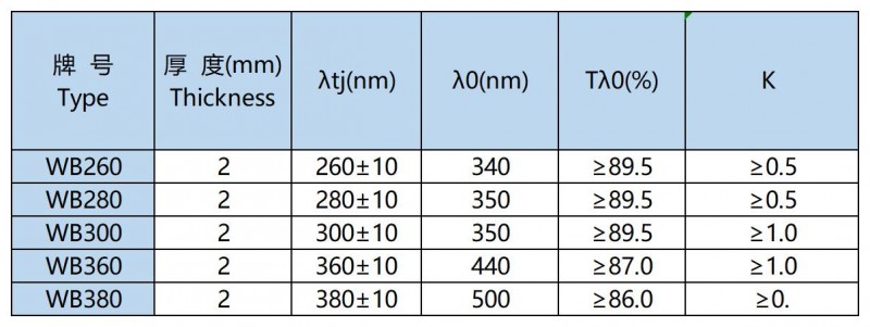 从图表可以看出,它们全部透过可见光,在紫外光部分有不同的截止波长和透过界限波长,是截止型玻璃,有色光学玻璃中,只有这类玻璃是无色的,称为无色紫外截止型玻璃,以无色玻璃WB命名:WB220、WB240、WB260、WB280、WB300、WB320、WB340、WB360、WB380