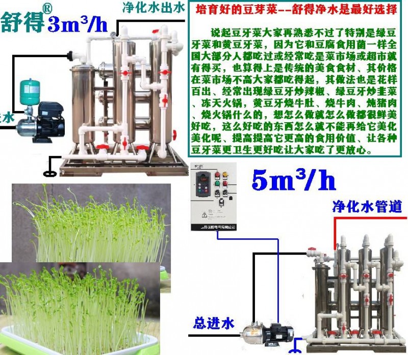 舒得井水过滤器不锈钢豆制品生产设备豆芽菜生产机械豆芽生产设备,我们是舒得水理设备生产厂家、业生产净化自来水井水河水的深度净化水理设备、净水设备大小规格齐全,自来水也好井水也好河水也好经过舒得净水机理后都是标准的矿化水直饮水纯净水也是无菌水、用这样的水生长出来的各种豆牙菜不会给您带来任何损失而只会给您带来利益、因为卫生提高上去了效益能差吗对吧。希望生产豆牙菜的生产基地生产厂家考虑配置舒得牌大型净水器、目前湖北省有多家配置了我们的设备用于井水净化来生产各种豆牙菜、特别是武汉市那边用的比较多、吃到他们生产的各种豆牙菜得感谢他们因为他们确实走到了卫生的前面。下面给大家介绍介绍净水设备的情况;