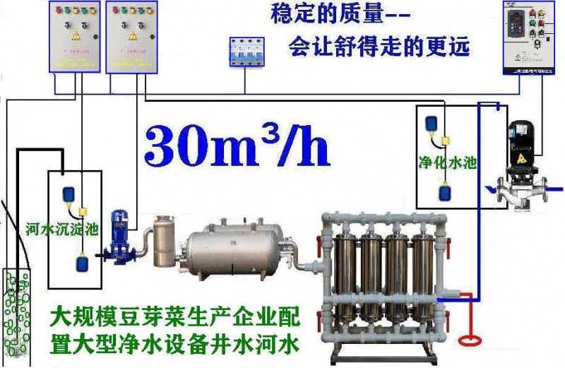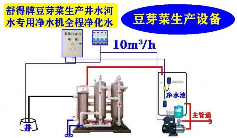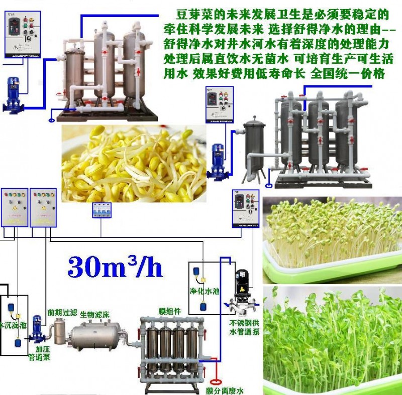 豆芽菜制作大型生产加工企业基本上80%会选择使用地下水、15%会选择使用河水、因为费用低水源足、地下水河水虽然水源足但是要重视的是水里含有大量寄生虫、群、大肠杆菌群、钙镁离子、有害的重金属比较严重,在不理的情况下长期使用比如寄生虫、群、大肠杆菌群、有害的重金属都会直接影响自家人和客人的身体健康,比如钙镁离子直接影响水加热器的结垢、