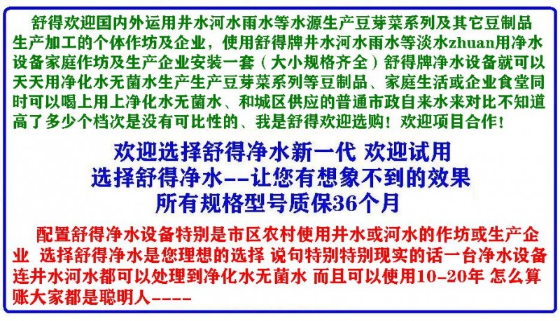豆制品生产设备豆芽菜生产机械用井水过滤器净水机,井水也好河水也好经过舒得净水机理后都是标准的矿化水直饮水纯净水也是无菌水、用这样的水来加工豆腐不会给您带来任何损失而只会给您带来利益、因为卫生提高上去了效益能差吗对吧,这么多年下来购买我们的净水设备用于加工豆腐方面的不超过30家、而且大部分是河北省东北的豆腐加工企业。