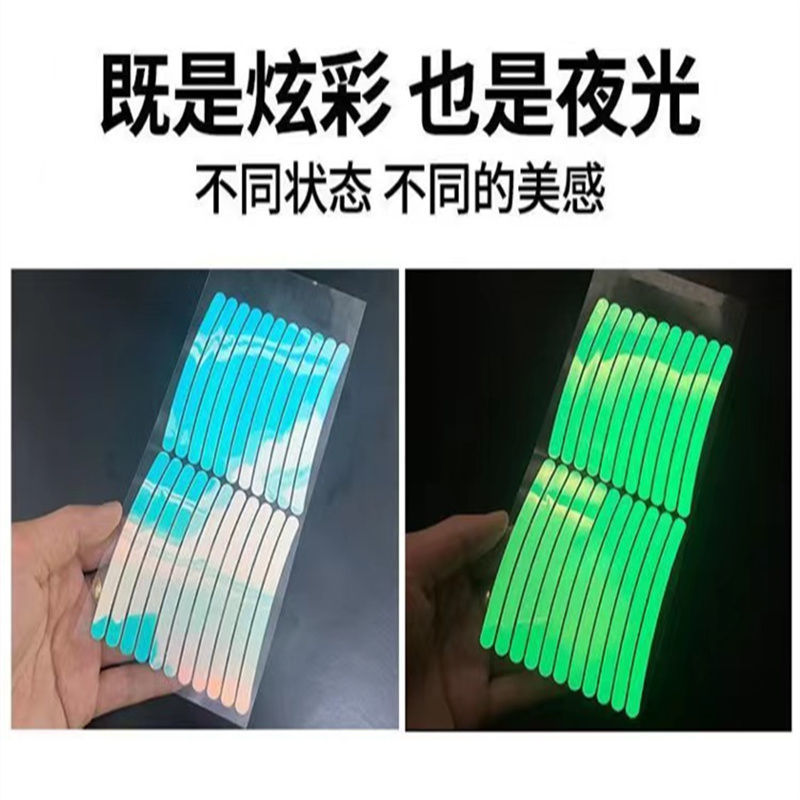 产品简介:炫彩夜光刻字膜是一款既能七彩渐变同时又能蓄光夜光的反光膜;适用于车辆车轮毂车贴;