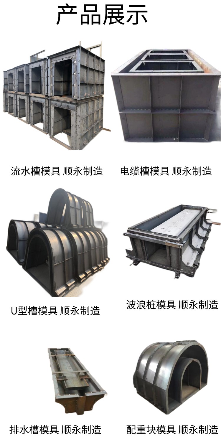 矩形水渠钢模具随着我国经济保持持续的增长,模具产业将保持高速增长并带动模具制造工业的发展。预计今后模具总体需求还会有很大的发展空间,也会使模具各方面有所创新。特别是结构方面,主要是以生产预制混凝土为主,模具的材质一般分为注塑成型还有模具成型,生产原理是将混凝土倒入模具或铁模具内,等水泥凝固后在拆模或者脱模即可成型,模具主要采用3-5mm的优质钢材,焊接成型材质直接影响模具的使用寿命。同时不变形,不破损,能够长时间使用。