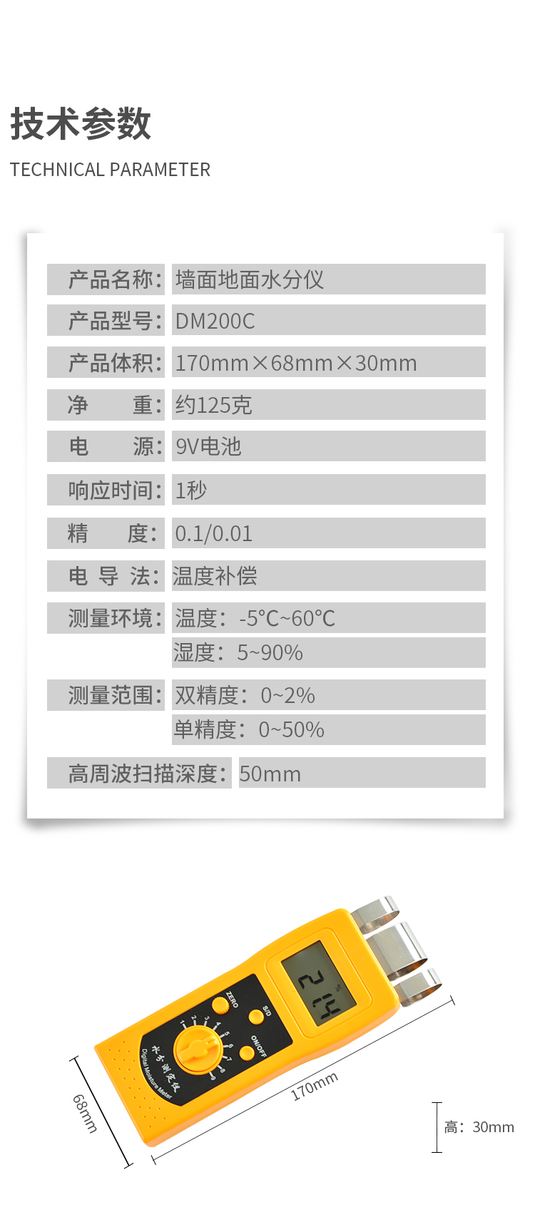 DM200C墙面地面水分仪:该仪器主要用于地板铺设、涂料粉刷、地坪上漆、建筑装潢、工地施工过程中理想仪器。该仪器通常被不同用户的客户称为墙体水分仪、地面水分仪、混凝土水分仪、石膏板水分仪等等。该仪器可测定水分的产品比较广泛,主要有:墙面(墙体、墙壁、墙砖)、地面(水泥地面、地坪、环氧地坪、混凝土)、石膏板、大理石、泥坯、地砖、瓷砖等。