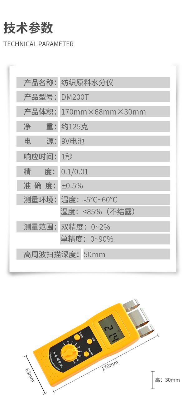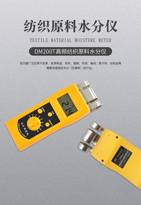纺织原料水分仪DM200T是我公司研发生产的高性能、数字化的水分测定仪器。该仪器广泛应用于皮革、皮革制品、布料、服装、纱线、轴线、筒子纱、纺织品等需要快速测定水分(回潮率)的行业。该仪器测量水分范围宽、精度高、显示清晰、测量迅速、性能稳定、指标可靠,而且体积小、重量轻,可随身携带在现场快速检测,使用简单方便。