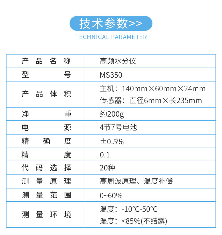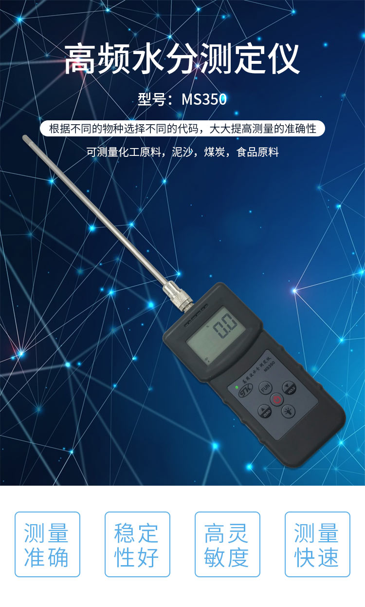 化工原料水分仪MS350是我公司研发生产的高性能、数字化水分测量仪器。仪器采用高周波原理,数字显示,传感器与主体合为一体,设有多个档位用来测量各类碱活性染料、化学矿物原料、有机、无机化工原料、染料、树脂、洗衣粉、金属皂、添加剂、煤炭、化肥、塑料粒子、中西药等粉状、颗粒状水分。该仪器测量水分范围宽、精度高、显示清晰、测量迅速、性能稳定、指标可靠,而且体积小、重量轻,可随身携带在现场快速检测,使用简单方便。是化工行业检测其产品水分的理想仪器。
