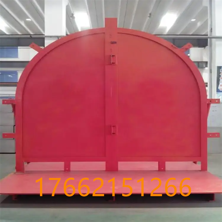 斜井防爆门主要用于矿山斜井口。当井下发生时,冲击波将该防爆门向外冲开,起到释放并缓解斜井冲击波的作用。1、本设计适用于通负压为350毫米水柱扇机为抽出式;24小时销售电话:17662151266(VX同号)2、件号7焊接钢管在反时应用,正常工作时不用要妥善保管;3、防爆门的运输应采取必要措施防止变形;4、防爆门的门框安装要与采矿专业密切配合,严防变形;5、门框与门扇的配合,力求紧密门框中柱后部加胶皮防止漏;6、件号3合页安装时加油润滑要保证灵活,防止锈死、逼劲;7、防爆门全部应涂红色樟丹,再涂黑色油漆。