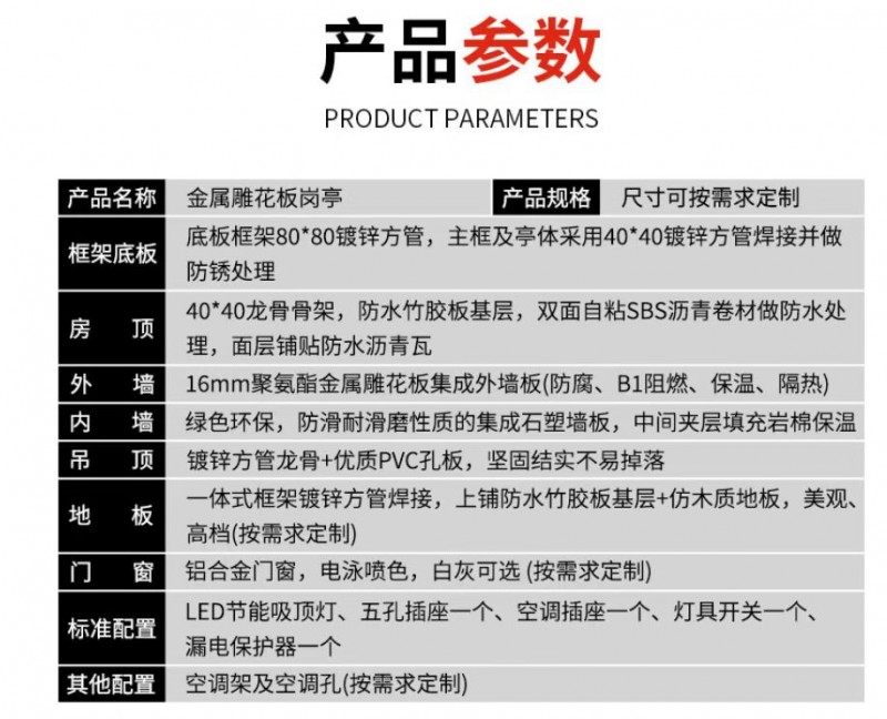 1、钢结构岗亭是工厂化设计、生产、制作好的成品钢结构活动房,镀锌钢管为主结构框架,采用环保墙体维护材料,外墙氟碳漆喷漆或金属雕花板及其它外墙装饰材料,经久耐用,可定制不同规格及形状的产品。