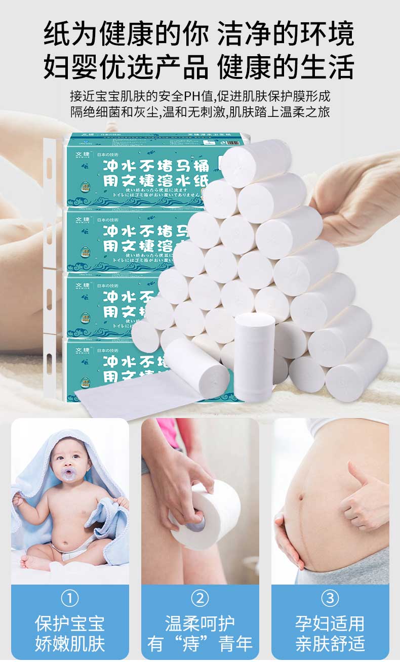 文捷易溶卫生纸批发,国内一款不堵马桶的卫生纸。文捷溶水卫生纸,冲水快速溶水,在马桶冲力的作用下,能快速碎解 ,完全不会堵塞马桶,文捷作为厚积薄发的品牌,会带领溶水卫生纸市场。