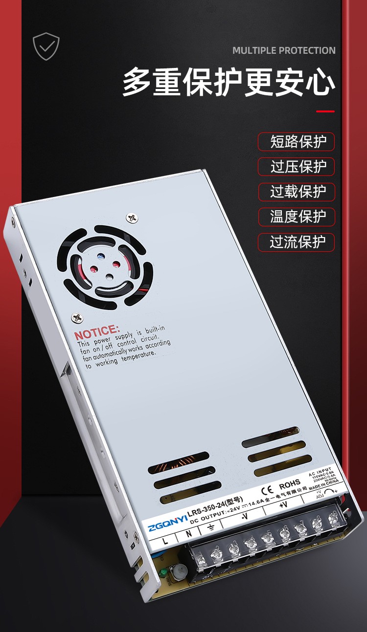 LRS室内电源系列:交流输入范围大,通过开关切换,可承受300vac浪涌输入5秒,保护种类:短路,过负载,