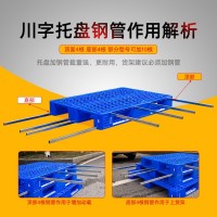 川字网格托盘共有8个钢管槽,面4腿4。面部钢管作用于增加动载腿部钢管作用于上货架。