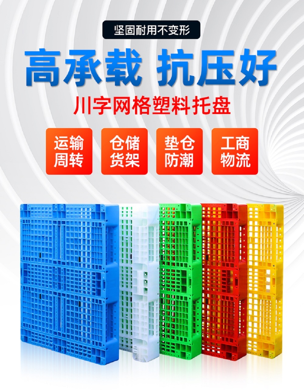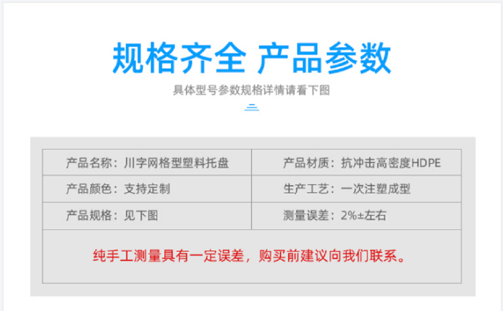 我们有网格川字、平板川字、网格田字、网格双面、焊接、网格九脚、平板九脚等多种规格型号的托盘任您选择,支持印制LOGO、定做颜色等。