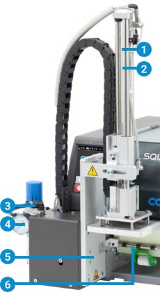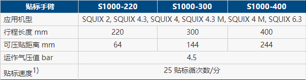 针对所有具备剥离功能的条码打印机,贴标手臂 S1000 搭配条码打印机 SQUIX 是相当经济实惠的解决方案 - 不仅可半自动操作也能垂直建置于生产线上。借由举升缸将标签贴在产品上。