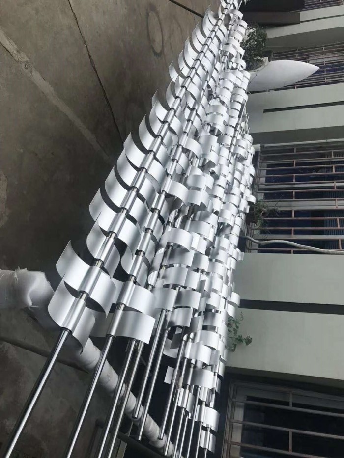 动力雕塑,是借用力的作用力,打破动雕塑的平衡,并且按照自己设计的转动规则不停地转动旋转,从而产生引人注目的动态效果。这种动力雕塑又叫动雕塑,或者动态雕塑,也叫力雕塑。 先从电脑里面模拟转动可以了开展制作各个零件的模具制作零件 .要折弯304不锈钢圆棒 304不锈钢扁钢材质很硬折弯的过程历经很多次才能达到想要的弧度,折弯之后开始给每片叶子钻孔,用以安装转动装置。每个叶片制作好之后,要做到尺寸上没一点的误差,否者产品不会转动。每片叶片手工安装在钢杆上,要达到每片叶片轻轻地吹动即可转动的效果,再安装在框架上,微轻拂发出悦耳的声音。