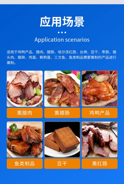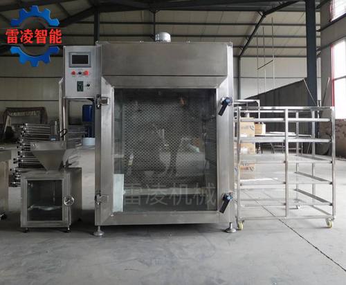 烟熏炉可定制为蒸,电两用加热方式。适用于用于香肠,火腿,烤肠,培根,腊肉,烤鸡,重鱼,烤鸭以及家离,水产品等重制产品,烘烤烘干,上色一次成型烟重色泽好,口感更佳质量保证,技术优良操作方便。经过烟熏后食品的颜色好看,还有一种烟重后的香味,让人感觉香而不腻,也能达到环保效果,代替了传统的烟熏方法。