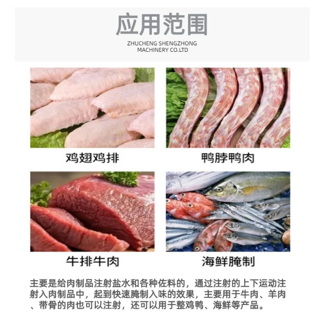 盐水注射机可根据不同工艺要求,调整步进速度,步进距离,压肉板间隙及注射压力,将腌渍液均匀连续地注入肉中,达到理想的注射效果。