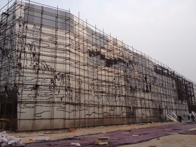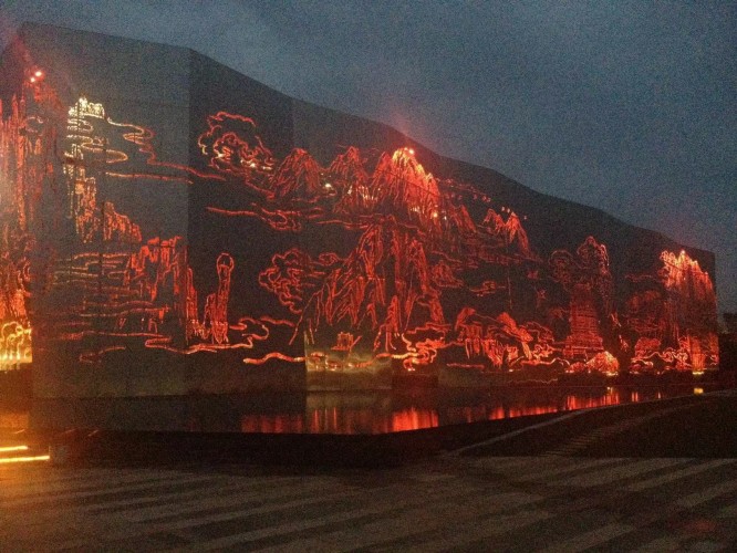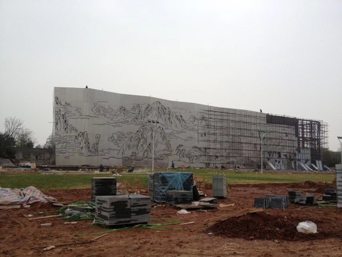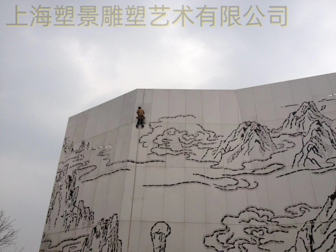 长120米的不锈钢艺术卷轴画浮雕安装在南昌九龙湖绿地,大型灯光景观墙上雕刻着山水画,白近观做工细致、纹理清晰、线条流畅;远观是一副潺潺流水的山水画,落日晚霞折射在景墙上,蓝云白晚霞似火,霞光多变一会儿红彤彤、一会儿金灿灿的,唯美吸睛;夜晚在灯光的照耀下、整个浮雕上的山水画山高水流水光影影、山似雾环绕甚是壮观。是一个城市标志性的景观建筑。