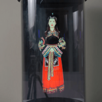 虚拟智能解说员是一款充分体现语音识别技术和图像合成技术的展项。主要形式分为两种,一是事先拍摄好的真人讲解,二是3D建模的卡通人物。以真人图像合成为例,通过图像合成技术,解说员的影像悬浮在透明的全息玻璃之上,当游客走到屏幕前时,系统接收到红外感应触发信号,虚拟解说员即开始自动为观众推荐及介绍展厅的主题分布及特色展区。
