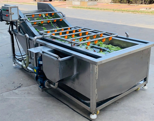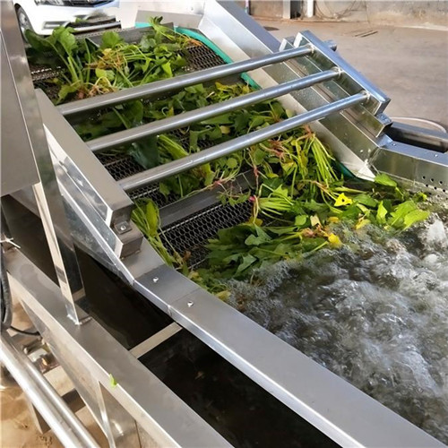 首先需要清洗的蔬菜全部放入水槽,在高压水流和泡的作用下,被充分打散、翻滚、清洗、传送。蔬菜表面的泥沙会脱落,网带清洗机沉淀到底部隔离仓,防止翻扬回流造成再度污染。从而蔬菜上洗落下来的杂物和小虫会漂浮在水面,然后被网孔收集,溢出水槽的水流被排除水箱,进入尼龙袋中。蔬菜被蔬菜清洗机洗干净后,再经过喷淋的清洗,网带清洗机然后通过输送带送出,传送带末端有一个吹起装置,没有被清理掉的杂物被吹掉。(食品加工机械厂家Tel:138*5448-1138)