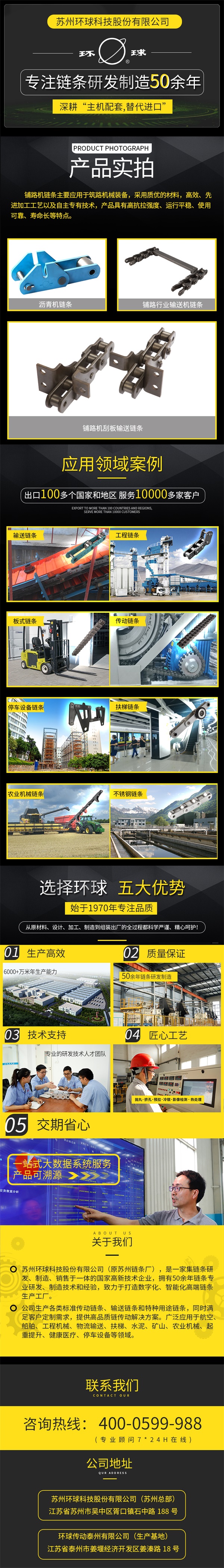 公司生产各类传动链、输送链、曳引链和特种用途链条,满足客户定制。广泛应用于工程机械、物流输送、自动扶梯、水泥、矿山、农业机械、起重提升、健康医疗、停车设备等领域。