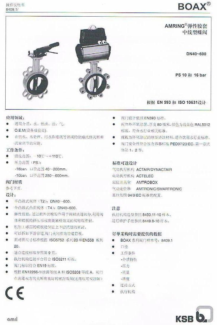 凯士比KSB阀门:凯士比KSB蝶阀型号BOA-X应用领域: