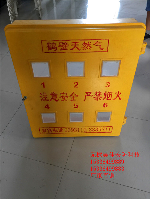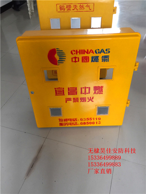 组合一位SMC玻璃钢燃表箱的箱体正面装有箱门,箱门上设有观察孔,观察孔装有注塑而成的聚 碳有机玻璃块或玻璃块,观察孔专为方便插卡换电池设计,根据实际需要可生产为活动滑块或固定观察孔。箱门与箱体的连接采用整体的合页与锁鼻法兰,配备燃 专用锁,箱体上设有进管安装孔和出管安装孔,箱体不设后盖板,进管安装孔和出管安装孔在燃表箱施工现场临时开设或按客户设计好的位置出厂前进行 开孔。表箱制作完成后,根据客户需要,在适当位置喷涂相关标识及电话等。