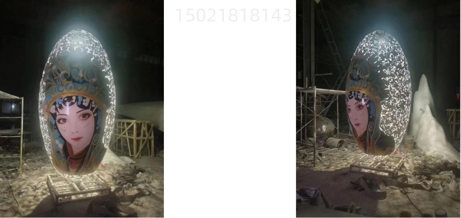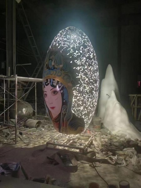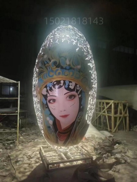 彩绘脸谱雕塑新工艺制作,花纹镂空鸡蛋造型上彩绘国潮脸谱,工艺新颖是我国传统京剧的四大名角色演出的格、其面具的造型设计创作出一组雕塑造型。根据比例放大采用的是不锈钢材质、生、旦角色脸型制作,很有国潮。放在广场、商业街、公园、街道,供游客欣赏、参观。