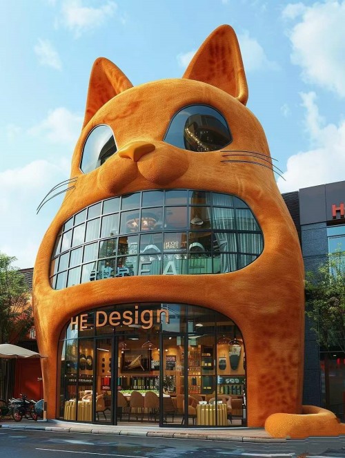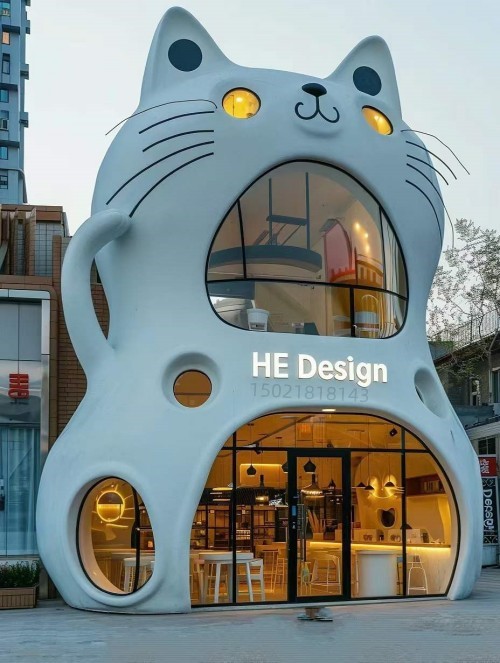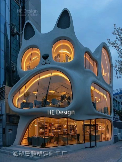 波斯猫建筑雕塑以猫咪的卡爱形象做造型,猫脊背为实体建筑成为整个建筑的承重、猫眼为窗、猫腹为门,配上猫鼻和长长的猫须,让猫咪的表情丰富多样,在城市广场夜晚的灯光开启中,明亮而夺目,是商业建筑的核心,专卖店展示作品的好选择。