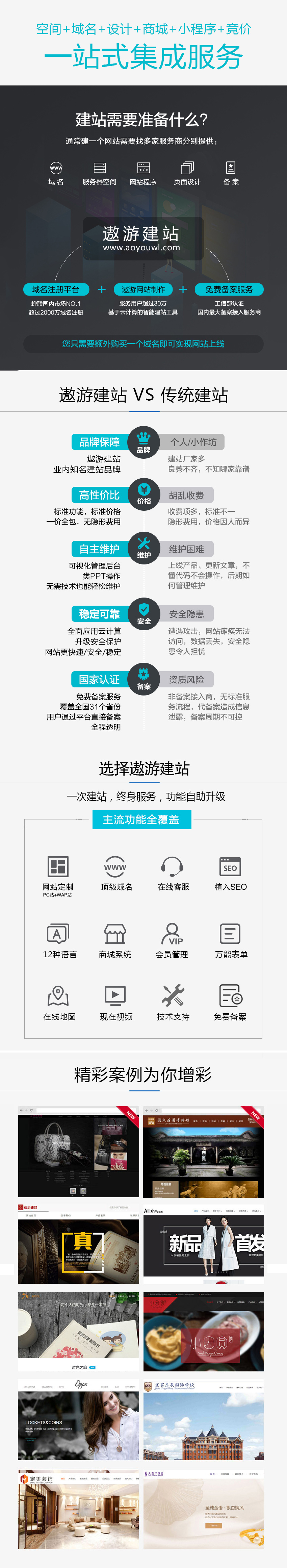 遨游以“靠谱的建站系统”享誉业界,以市场需求为导向、以客户利益为出发点,积累了丰富的建站经验,植入SEO优化理念,让你的网站更利于搜索引擎抓取,关键词排名更靠前,为客户提供一站式解决方案;遨游秉承一次建站,终身维护”的服务宗旨,以诚信、务实、质量为目标,用的系统和优质的售后,不断为客户创造新价值!