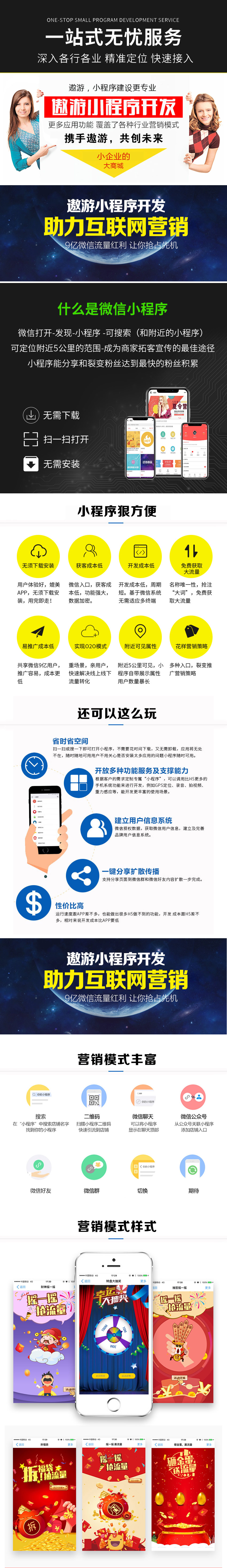 互联网发展进入新时代,APP像BB机一样,很快被小程序取代。企业可以没APP,但绝不能没有小程序。小程序相比APP来说,优势很明显,主要是小程序依附于腾讯强大的微信平台,无需另行安装植入手机,极大的节约空间,让手机流畅运行,同时,又及其方便的与微信朋友互动,这让广大做生意的朋友无坚不摧、无往不利!目前,小程序开发公司大都费用昂贵,企业选择还比较困难,基于小程序强大的市场需求,遨游建站精心组织开发团队,为中小企业量身定制小巧精悍的小程序——小程序开发,我们选遨游!