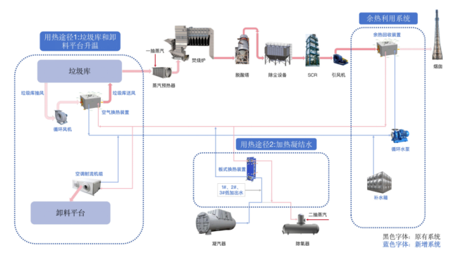 根据垃圾焚烧电厂的用热需求,可将回收的余热用于加热凝结水,提高除氧器进水温度,降低除氧器对蒸汽的消耗,可为企业节省大量的蒸汽,也可用于加热焚烧炉一次,提高焚烧炉的进温度,减少新蒸汽的消耗,节约的蒸汽可用于发电或供热,提高企业的经济效益。另外,采暖季时,回收的余热通过空换热装置可为垃圾库升温使用,提高垃圾库环境温度,减少垃圾发酵时间,提高垃圾理效率。同时,回收的余热可以通过射流机组供卸料平台采暖使用或用于加热锅炉补水、供热、洗浴、制冷等。