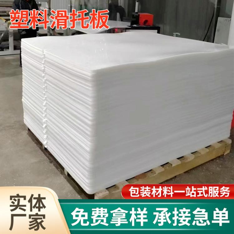 塑料滑托板,又名塑料滑托、塑料滑托盘、滑板托盘、推拉器板、塑料滑片、SlipSheet等,采用高密度HDPE原料制造而成,有很好的强度及韧性,抗用、耐湿、环保,它轻便且易于操作,可以承受各种重量和压力,同时还能抵抗化学物质的侵蚀和磨损,是替代木、纸、塑料栈板的理想换代产品,除了具有价格优势外,还具有防滑、抗静电、无味等特性,使其成为广泛应用于包装、运输、仓储等领域的理想选择。