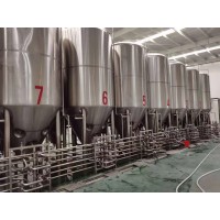 发酵系统说明:此阶段为啤酒酿造阶段。具体流程为:投料-糖化-过滤-煮沸(添加酒花)-回旋沉淀-麦汁热交换,然后泵入发酵罐进行发酵。啤酒发酵罐存储12-15时间即可发酵储存成熟。